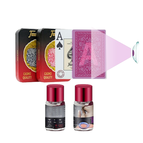 Fournier 2818 Marked cards magic have invisible markers on their backs. These invisible marker with light can’t be detected unless users wear specialized infrared contact lenses. Through the lenses, users can see clearly that there is a big font in the middle of the Bicycle poker cards.