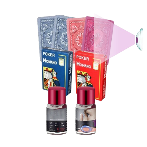 Modiano Cristallo Marked cards magic have invisible markers on their backs. These invisible marker with light can’t be detected unless users wear specialized infrared contact lenses. Through the lenses, users can see clearly that there is a big font in the middle of the poker cards.